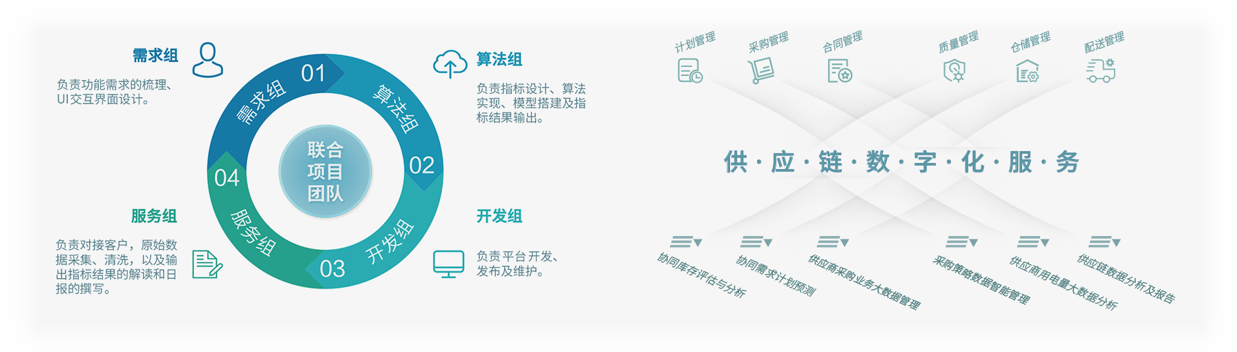 以“業(yè)務(wù)+技術(shù)”的工作模式,派駐數(shù)字化服務(wù)團隊與客戶開展聯(lián)合辦公,通過提供業(yè)務(wù)診斷、工具開發(fā)、數(shù)據(jù)清洗、模型訓練等服務(wù),幫助客戶將物聯(lián)網(wǎng)、人工智能、大數(shù)據(jù)分析等前沿技術(shù)嵌入其核心業(yè)務(wù)流程,助力客戶企業(yè)以更快速度、更大規(guī)模推動供應(yīng)鏈發(fā)展與變革。